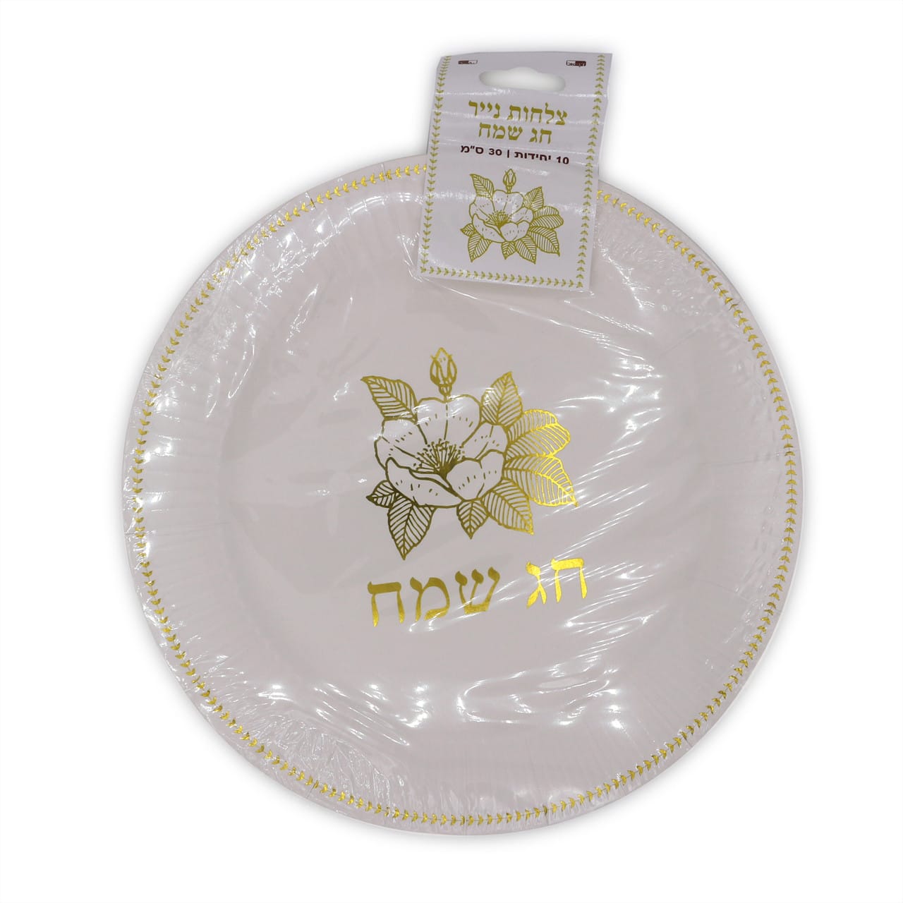 / 10 צלחות נייר חג שמח לבן זהב 30 ס"מ